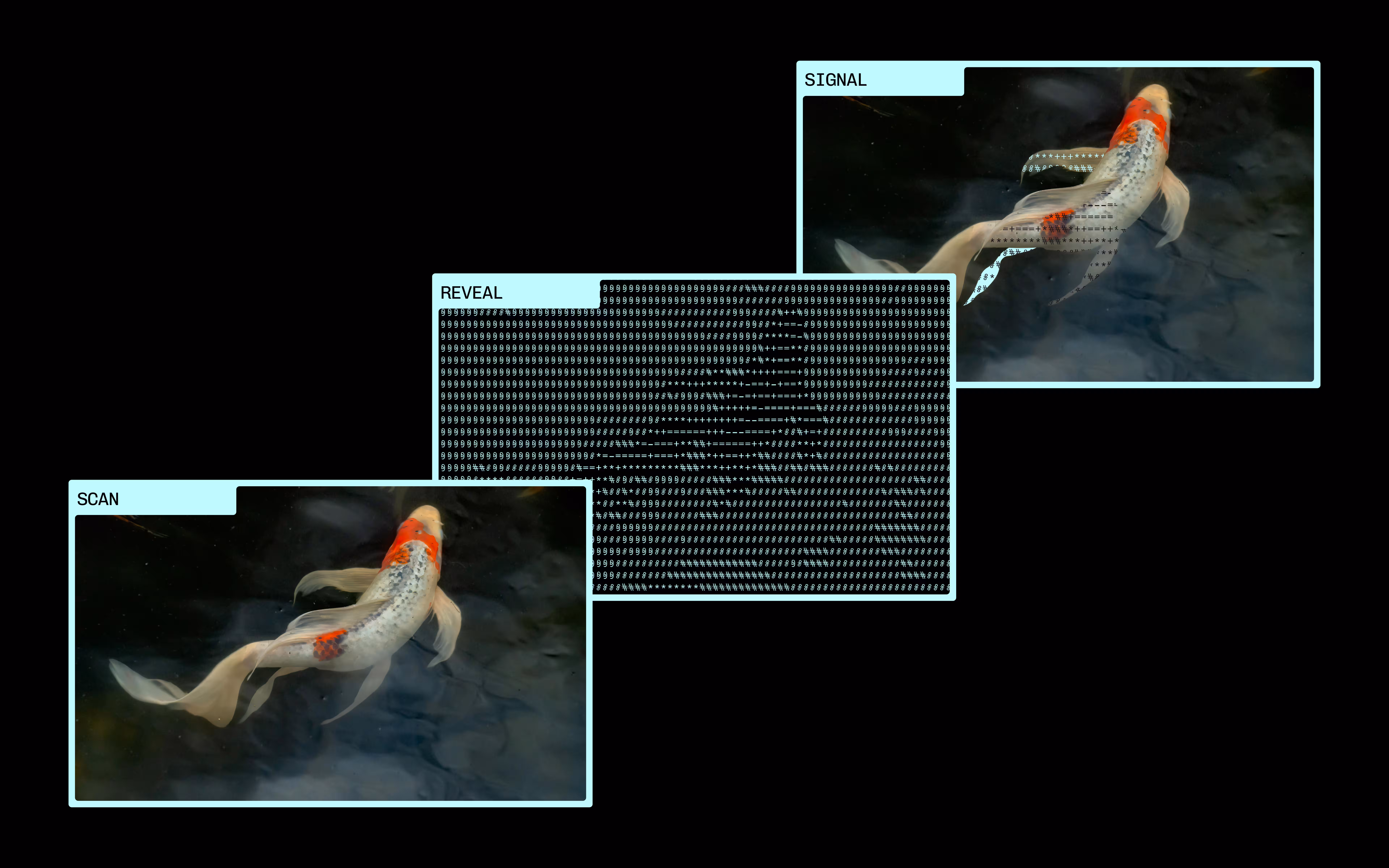 The brand draws on contrast. Scenes from the animal kingdom, rich and instinctive, are juxtaposed with machine perception and artificial sense making. A deliberately simple colour palette heightens this tension, allowing striking visuals where organic complexity meets computational focus and selective attention.